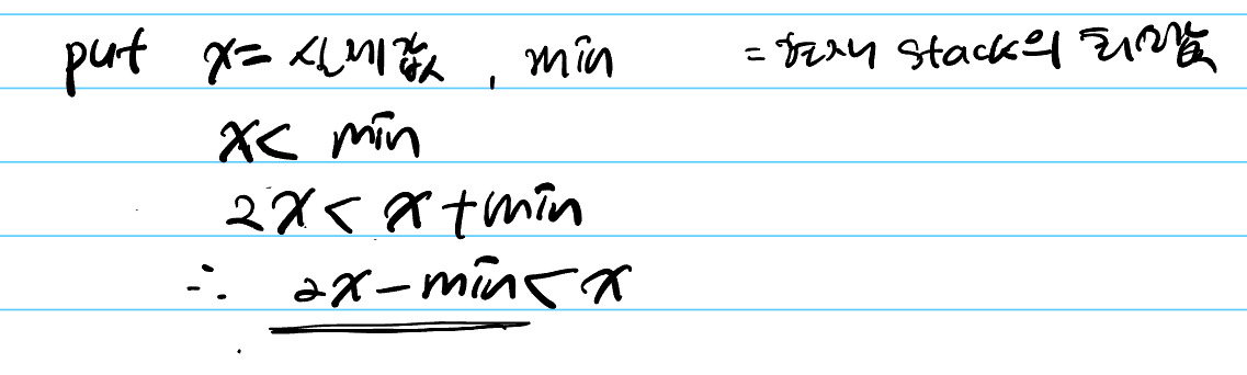 push() 연산은 다음과 같이 진행합니다. 스택이 비어있거나, 스택의 최솟값보다 큰 값이 새롭게 삽입된다면 그 값 그대로 삽입합니다. 스택의 최솟값보다 더 작은 값이 새롭게 삽입되어 최솟값이 갱신되어야한다면 실제 값이 아닌 변형된 값 (2 * 실제값 - 최솟값) 을 저장합니다. (2 * 실제값 - 최솟값) 은 항상 실제값보다 작습니다. 따라서 self.min에 저장된 값보다 작은값이 stack에 존재한다면 그 값은 실제 값이 아닌 변형된 값이라고 판단할 수 있습니다.