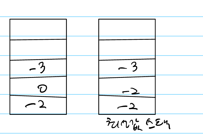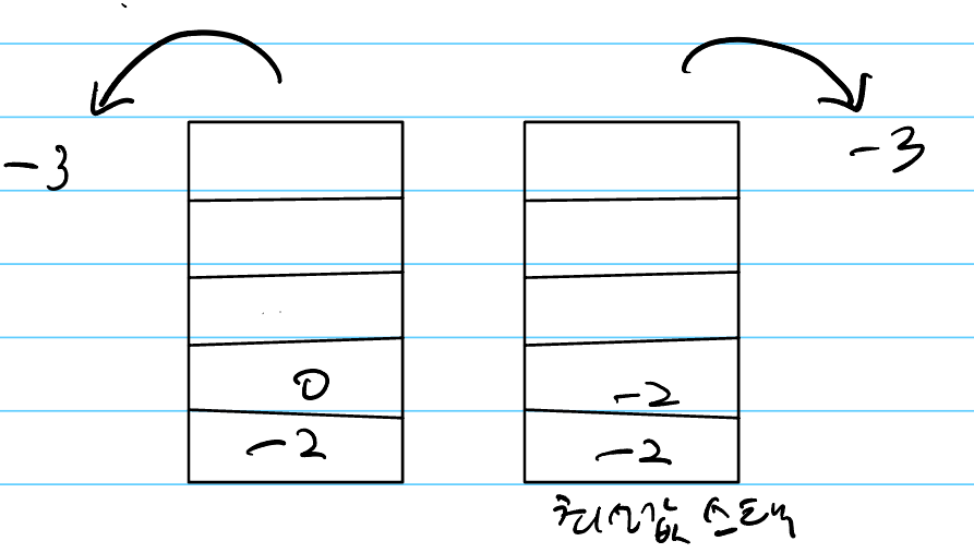 현재 최소값은 -3이 됩니다. 이 상태에서 Pop()이 호출되면 스택, 최솟값 스택의 top에서 각각 하나씩 원소가 삭제됩니다. 이때 스택과 최솟값 스택의 상태는 다음과 같습니다.