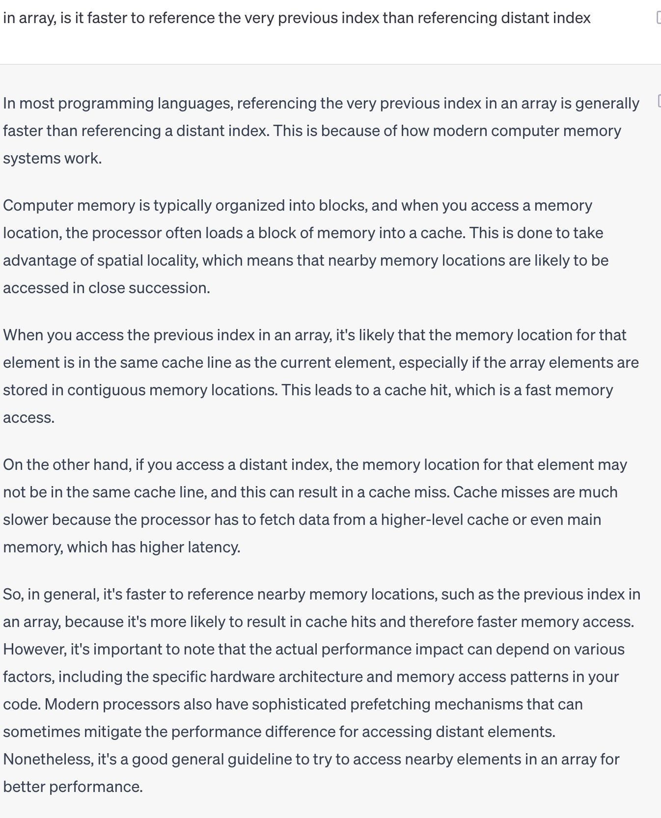 Chat-GPT의 답변을 요약하자면, 메모리를 블럭 단위로 읽어서 캐싱하기 때문에, 지역적으로 가까운 인덱스의 원소일수록 캐싱되어있을 확률이 높으므로 더 빠르게 참조가 가능하다(캐시의 spatial locality)는 것입니다.