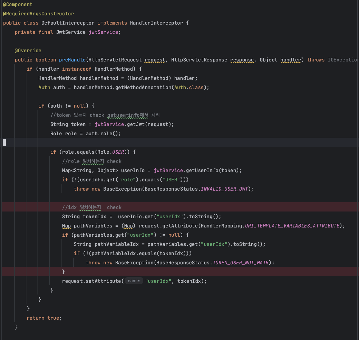Jwt 토큰의 검증은 인터셉터에서 처리된다. 아래는 핸들러 호출 전에 인터셉터의 preHandle()에서 Jwt 토큰을 검증하는 로직이다. @Auth 어노테이션이 적용된 핸들러의 경우, 토큰에 담긴 role을 확인하고, path variable이 있는 경우 path bariable과 토큰 정보가 일치하는지 확인한다. 이때, 스프링 컨테이너에 등록된 JwtService 빈을 주입받아 사용한다.