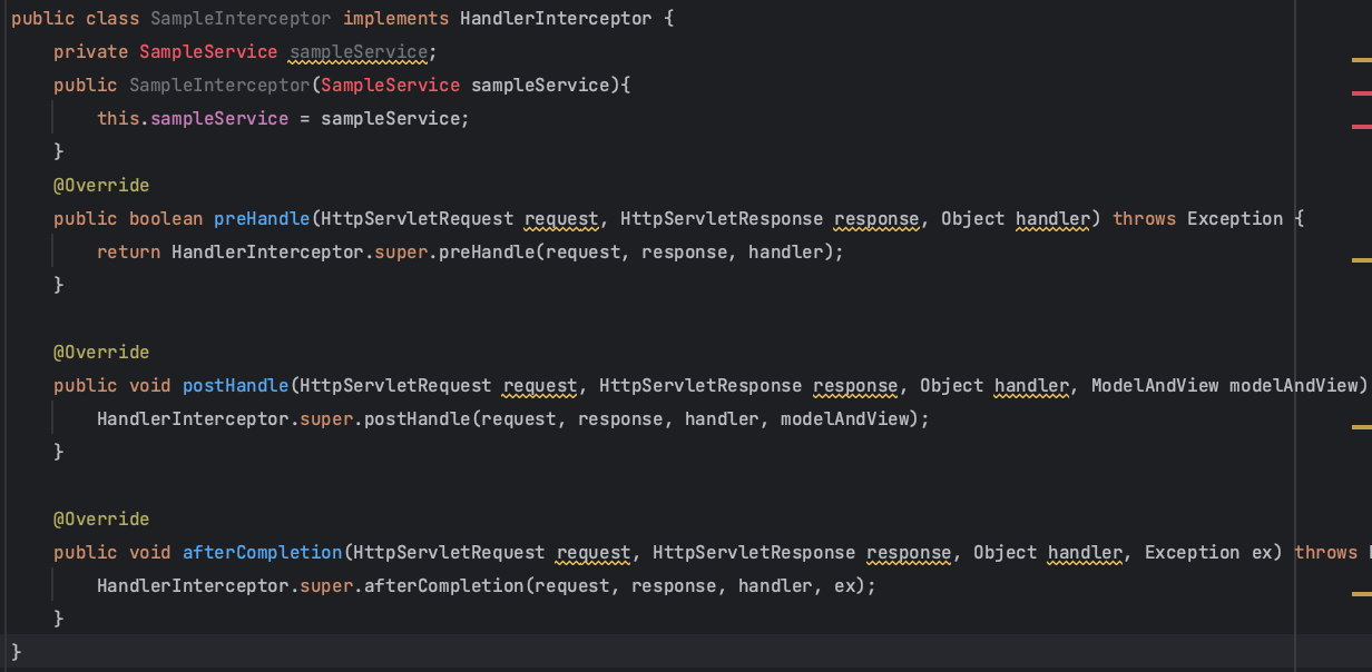반면에 인터셉터는 요청과 응답 외에도 매핑된 핸들러 정보, ModelAndView, 그리고 발생한 예외에 대한 정보도 전달받는다. 또한, 스프링 컨테이너에 의해 관리되기 때문에 필요한 빈들을 주입(DI)받아 수 있다. 위 SimpleDispatcherServlet에서 볼 수 있듯, 인터셉터에 의해서 발생한 예외들은 @ExceptionHandler등 Spring에 의해 처리 된다.