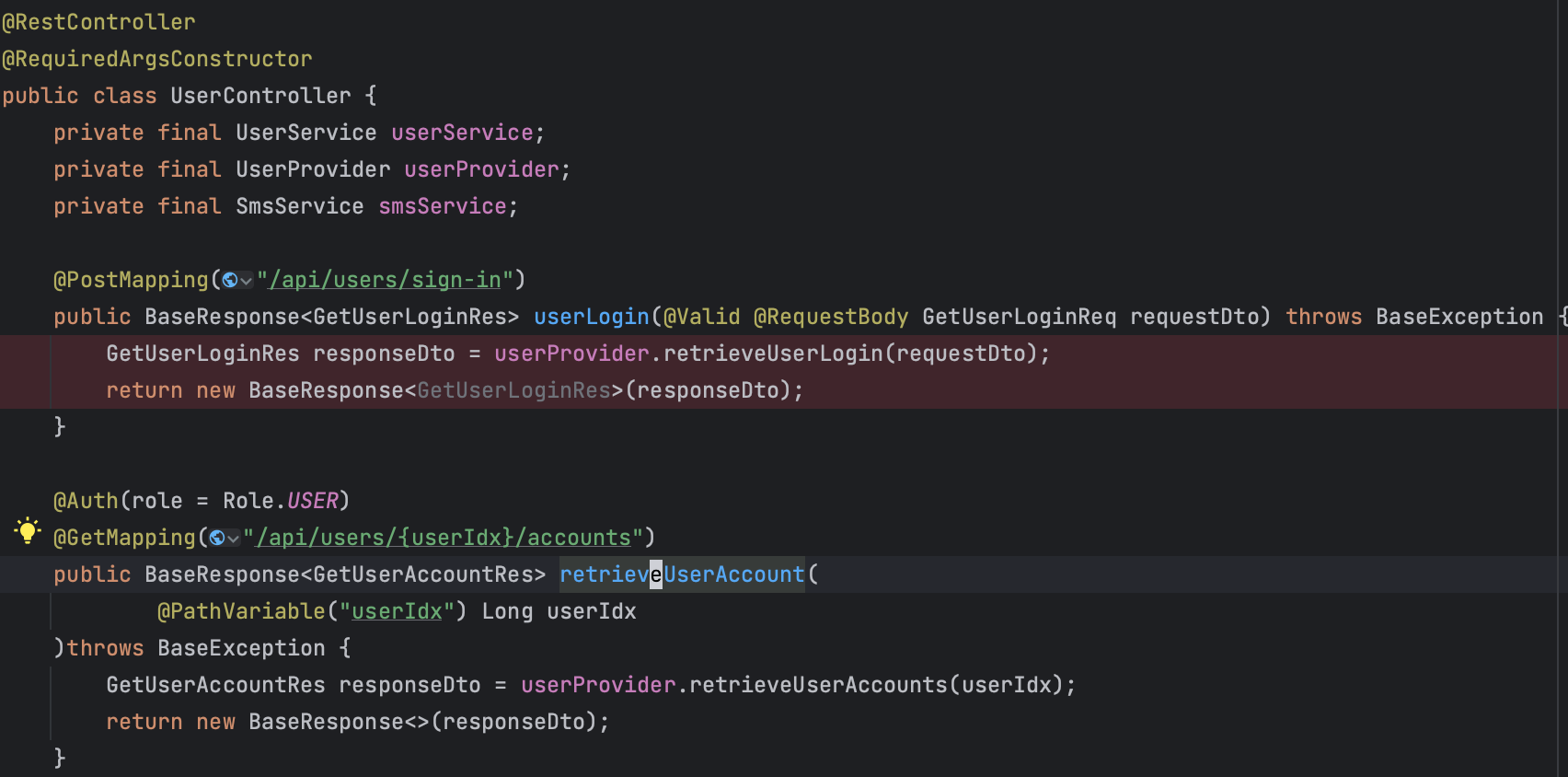 아래는 사용자 관련 API를 담당하는 UserController이다. 회원 전용 API에는 @Auth라는 커스텀 어노테이션이 붙어있으며, 이 어노테이션의 속성을 통해 해당 API에 필요한 권한(role)을 지정하였다. 예를 들어, 특정 회원의 정보를 조회하는 retrieveUserAccount() 에는 @Auth가 적용되어 있다. 반면에, 로그인 요청을 처리하는 retrieveUserLogin()은 인증하지 않은 사용자가 요청할 수 있으므로 @Auth가 적용되지 않았다.