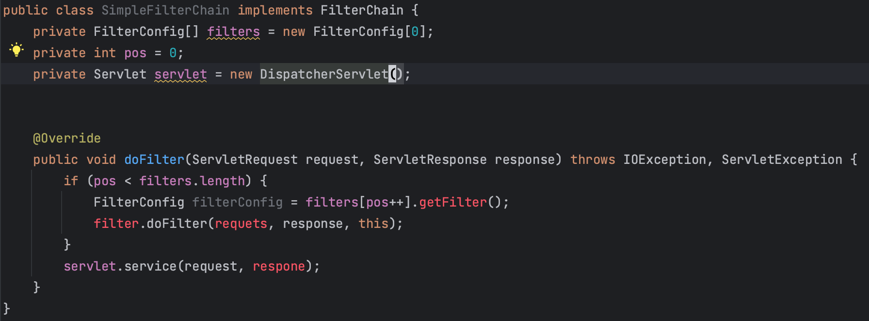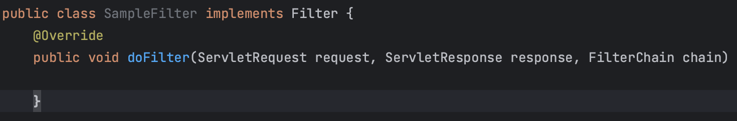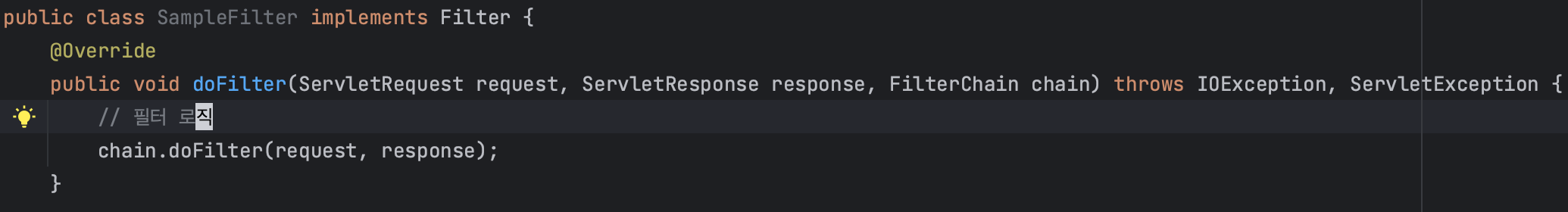 다음은 FilterChain과 Filter의 로직을 간략히 표현한 SimpleFilterChain과 SampleFilter이다. SimpleFilterChain은 서블릿 컨테이너에 등록된 필터들에 대한 정보를 배열(filters)로 관리한다. 요청이 doFilter()에 도착하면 SimpleFilterChain은 pos를 이용해 다음으로 실행할 필터정보를 가져온다. pos는 등록된 여러개의 필터 중 다음으로 실행할 필터의 인덱스를 나타내며 filters에서 정보를 가져오고 난 후 pos를 1 증가시켜 다음 필터를 가리키도록 한다. 한 필터의 실행이 끝나면, 해당 필터는 매개변수로 받았던 FilterChain에 대한 참조를 이용해 doFilter()를 호출함으로써 다음 필터의 실행을 유도한다. 모든 필터의 실행이 끝나면, 마지막으로 등록된 서블릿(DispatcherServlet)의 service()가 호출되어 요청과 응답이 처리된다.