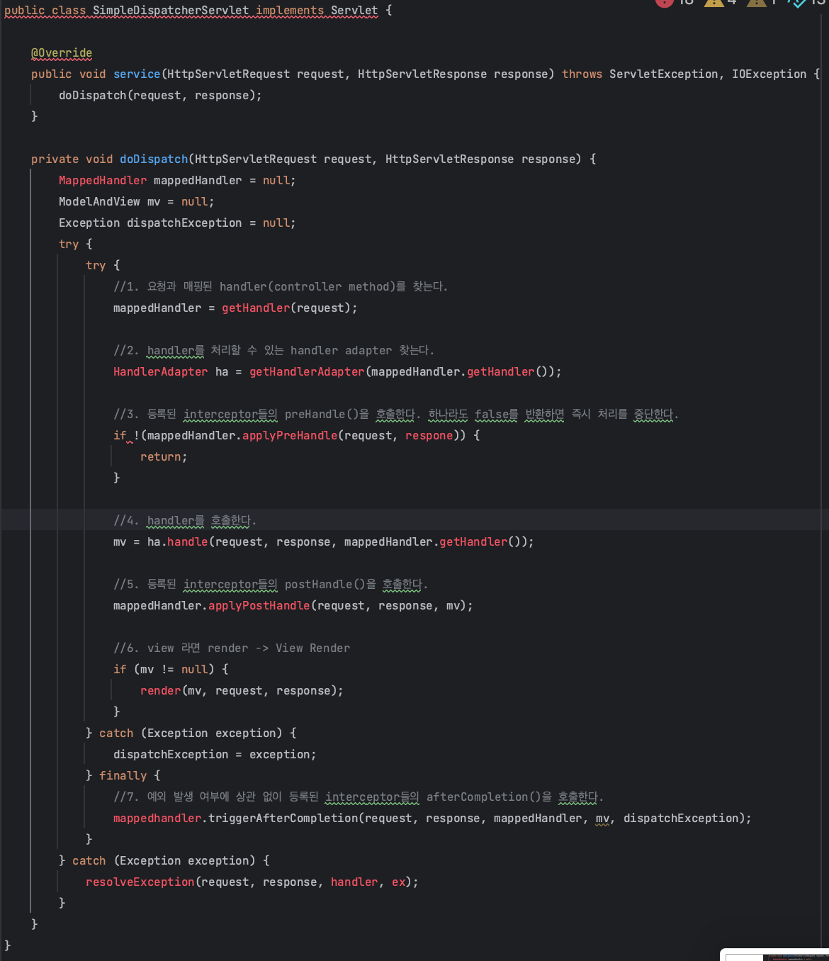 다음은 DispatcherServlet의 동작 과정을 간략히 표현한 코드이다. DispatcherServlet은 service() 내부에서 doDispatch()를 호출한다. doDispatch()에서는 먼저 요청에 요청에 매핑된 핸들러를 찾고, 해당 핸들러를 호출하기 전에 등록된 모든 인터셉터들의 preHandle()을 호출한다. 만약 어떤 인터셉터라도 false를 반환한다면, 그 시점에서 처리가 중단한다. 모든 인터셉터가 true를 반환하여 요청 처리를 계속하낟면, 실제 핸들러가 호출되어 컨트롤러로 요청이 전달됩니다. 컨트롤러에서의 처리가 완료된 후에는 해당 핸들러에 등록된 인터셉터들의 postHandle()을 호출한다. 모든 인터셉터의 postHandle() 실행이 완료된 후, 컨트롤러 반환값이 뷰 이름인 경우, 뷰를 렌더링한다. 위의 과정들 중 예외 발생 여부와 관계없이 최종적으로 finally 블록에서 처리되며, preHandle()에서 처리가 중단되었거나, 예외가 발생하였거나, 뷰 렌더가 완료된 후 인터셉터의 afterCompletion()이 호출된다.