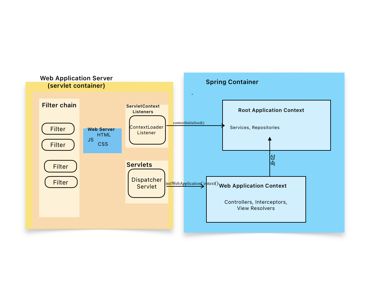 - 필터는 서블릿 컨테이너에 의해 관리되고, 인터셉터는 스프링 컨테이너에 의해 관리되는 빈이다. 스프링 컨테이너는 Root ApplicationContext와 Web ApplicationContext로 이루어진다. Root ApplicationContext는 서블릿 컨테이너가 초기화될때 ContextLoaderListener를 통해 생성되고, Web ApplicationContext는 DispatcherServlet 초기화 과정에서 생성된다. Root ApplicationContext는 어플리케이션 전반에 공유되어야하는 service, repository와 같은 빈들을 관리하고, Web ApplicationContext는 Root ApplicationContext를 상속받으면서 웹과 관련된 controller, handler mapping, interceptor, exception resolver등을 관리한다.