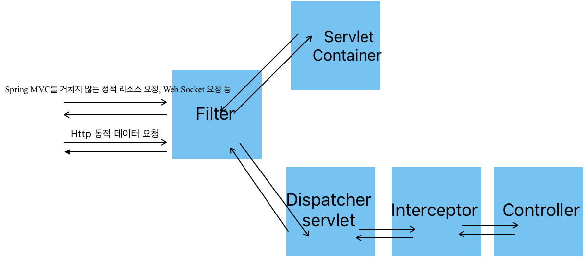 요청은 가장 먼저 필터에 도착한다. 정적 리소스 요청이나 Web Socket요청과 같이 Spring MVC와 무관한 요청들은 서블릿 컨테이너(혹은 그에 포함된 웹 서버)에서 처리되어 응답이 반환된다. 동적 컨텐츠에 대한 요청은 필터를 통과한 후 DispatcherServlet에 도착한 후, 컨트롤러가 실행되기 전에 인터셉터에 의해 처리된다. 컨트롤러 실행이 완료되면, 요청은 인터셉터를 거쳐 DispatcherServlet을 빠져나가고, 마지막으로 다시 필터를 거치게 된다. 이 과정을 자세히 살펴보자.