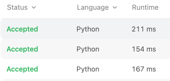 아래에서부터 접근방식1, 접근방식2, 접근방식3의 실행시간을 나타낸다. 따라서 실행시간을 기준으로 한다면 배열을 순회하는 접근방식 2가 가장 빠르고, deque자료구조를 사용하는 접근방식3이 가장 느리다.